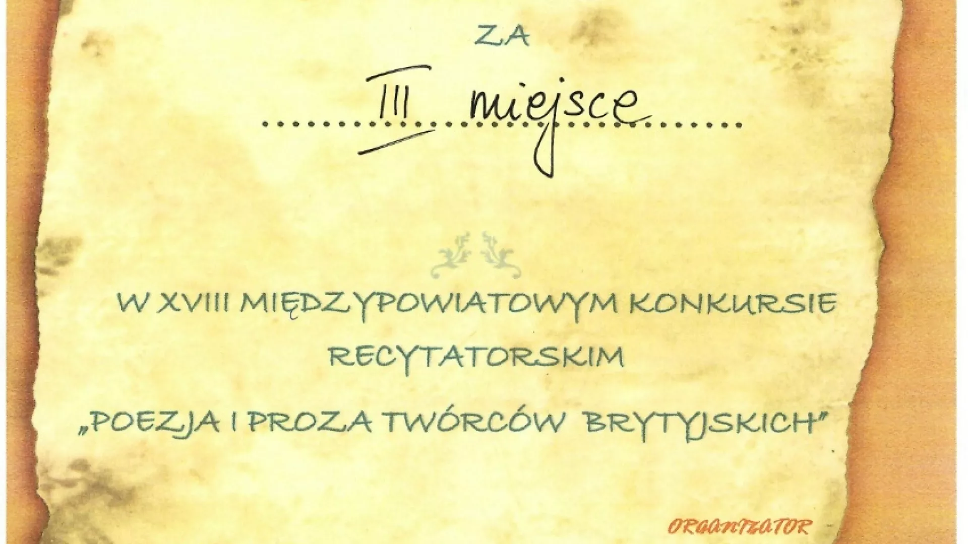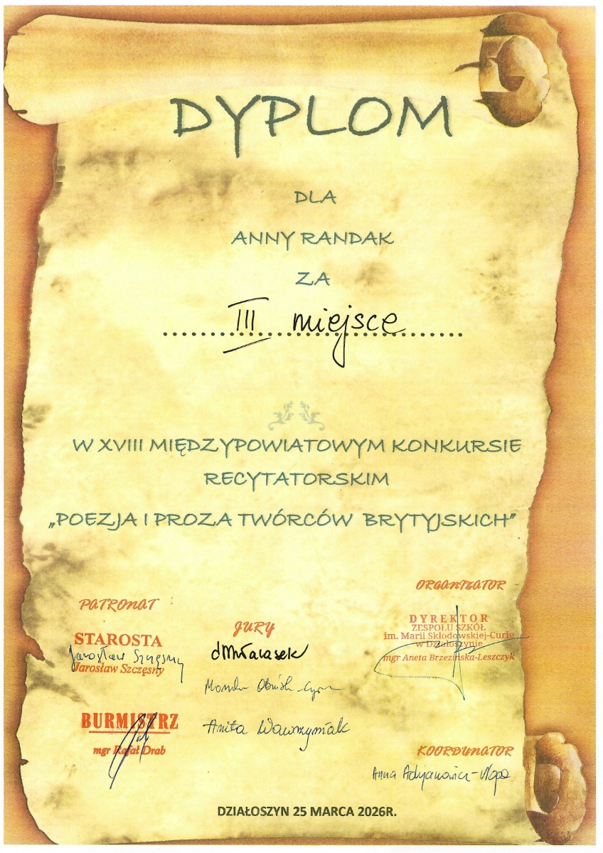 Również w tym konkursie nasza uczennica zajęła I miejsce, dopisując znaczący sukces do swoich osiągnięć związanych z językiem angielskim. Jej wystąpienie wyróżniało się nie tylko doskonałą znajomością języka, ale także pewnością siebie, kulturą słowa oraz umiejętnością budowania emocjonalnej więzi z publicznością.