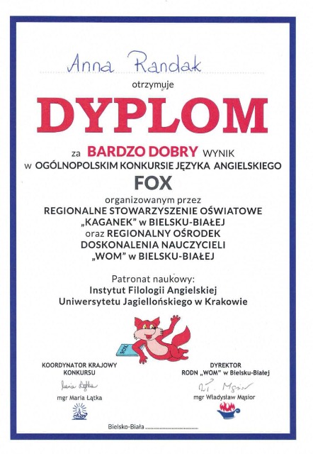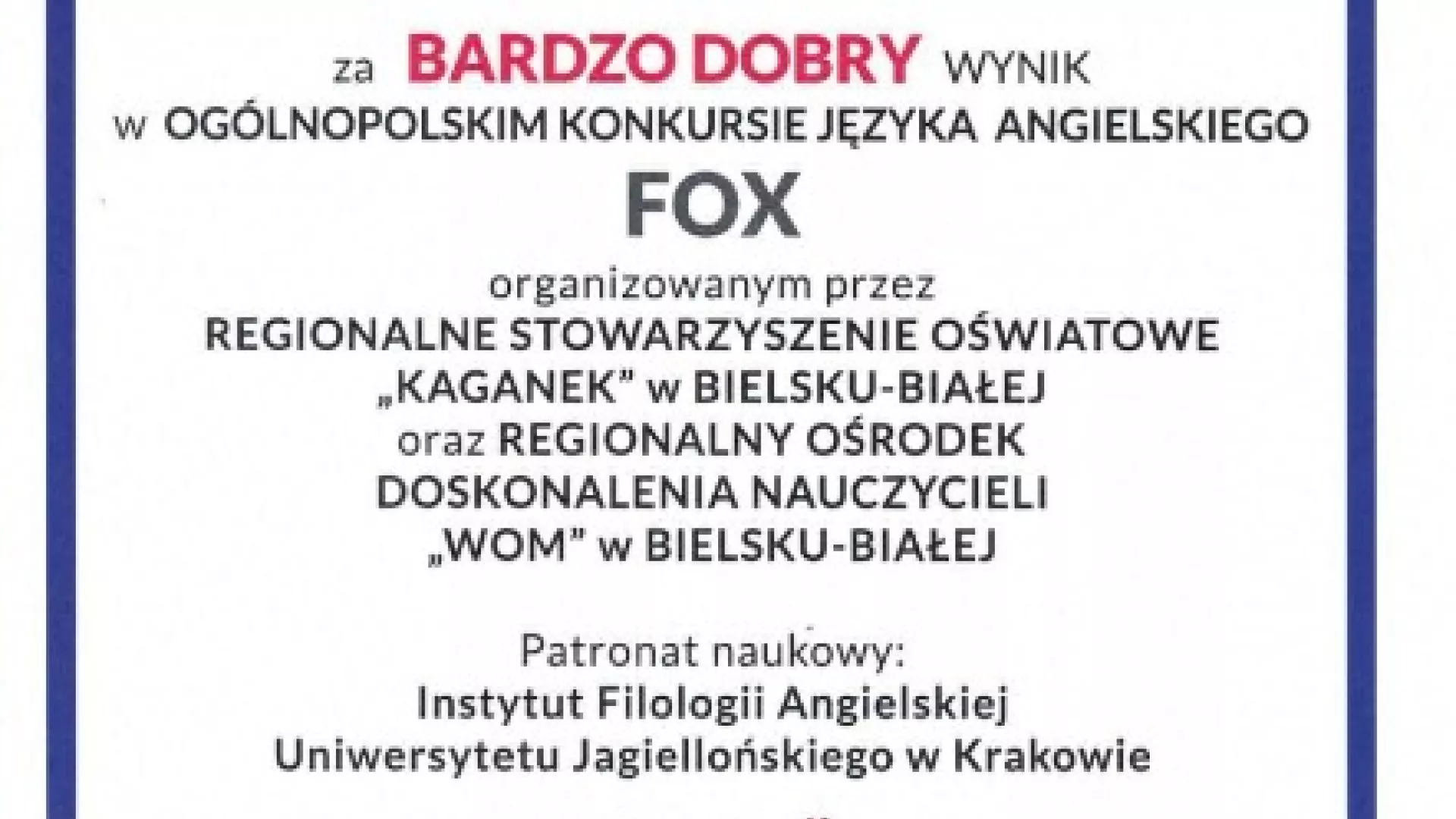 Warto podkreślić, że Anna nie ogranicza się jedynie do konkursów. Podjęła również bardzo ambitne wyzwanie, jakim jest udział w egzaminie Cambridge English: First (FCE). To międzynarodowy certyfikat potwierdzający znajomość języka angielskiego na poziomie C1, uznawany przez szkoły, uczelnie i instytucje na całym świecie. Przystępując do egzaminu FCE, Anna udowodniła, że jej kompetencje językowe wykraczają daleko poza szkolny program nauczania. Egzamin wymaga biegłości w czytaniu, pisaniu, słuchaniu oraz komunikacji ustnej — a więc wszechstronnych umiejętności. Jej udział w tym prestiżowym egzaminie jest naturalnym dopełnieniem licznych sukcesów konkursowych i świadectwem jej umiejętności językowych.