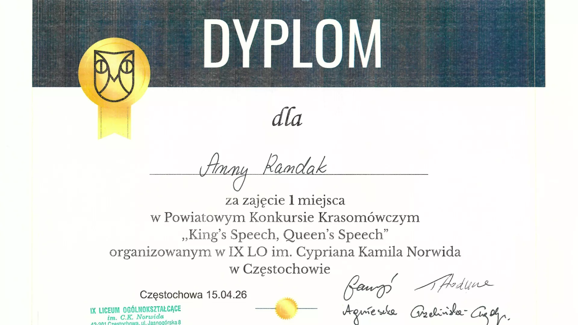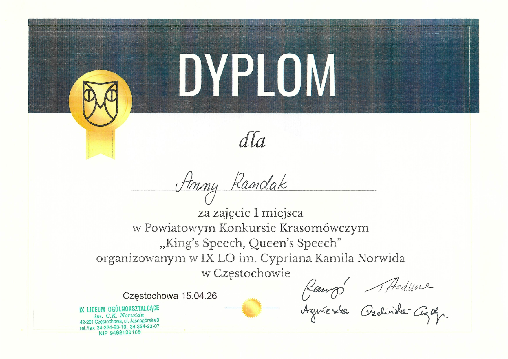 Kolejny sukces miał miejsce 15 kwietnia podczas tegorocznej edycji Powiatowego Konkursu Krasomówczego „King’s Speech / Queen’s Speech”, który odbył się w IX Liceum Ogólnokształcącym im. C.K. Norwida w Częstochowie. To wyjątkowe, anglojęzyczne wydarzenie skierowane było do uczniów klas VIII szkół podstawowych.